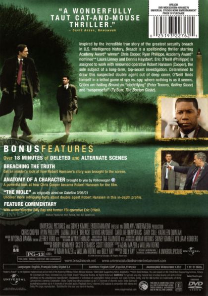 Based on true events, Breach tells the tale of two FBI agents, Robert Hanssen (Chris Cooper), a senior member of the Soviet Analytical Unit, and Eric O'Neill (Ryan Phillipe), a young computer specialist given the task of monitoring Hanssen. It is only later that O'Neill discovers his true objective - to find proof that Hanssen has been selling secrets to the Soviets and is being financially rewarded for his actions. The contradiction of an openly religious man betraying his country, to the extent that his actions constituted the worst security leak in US history, forms the basis of the story.