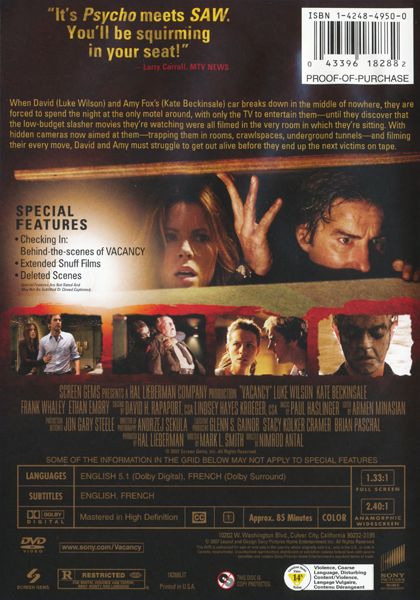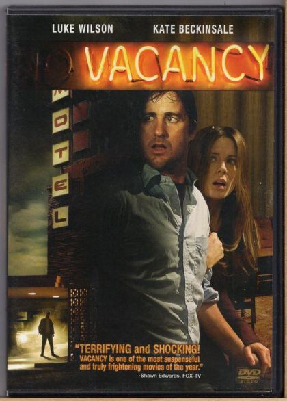 Vacancy is about a married couple, David Fox (Luke Wilson) and Amy Fox (Kate Beckinsale. They are on a road trip when their car suddenly breaks down in the middle of nowhere, leaving them stranded with nowhere to go... except for a run-down motel. Seemingly their only choice, they check in for the night, happy to have been able to find someplace to stay overnight. In their room, with the Television as their only form of entertainment, they watch these slasher movies and later realize that the movies that they are viewing were in fact filmed in the exact room that they are at. Now, they must find a way to escape before they become the next stars of the movie.