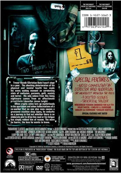Trevor Reznik (Christian Bale), a factory-employed machine operator, has been inexplicably unable to sleep for a year. His constant fatigue and gaunt condition lead not only to his role in a devastating accident to a fellow worker (Michael Ironside) but also to a series of increasingly disturbing hallucinations. Shortly after the accident, Trevor meets a new worker at the factory, a man with his own physical deformity named Ivan (John Sharian), who suspiciously begins showing up everywhere Trevor goes. Trouble is, no one else has ever seen or heard of anyone named Ivan. To compound his confusion, Trevor begins receiving a series of mysterious post-it notes on the refrigerator in his own apartment. Who is leaving these notes? Is someone perpetrating a plot against him? Is it Ivan? Is everyone in on it? Can he trust anyone? Trevor’s search for the truth leads him to answers he might never have imagined, and possibly never wanted to face.