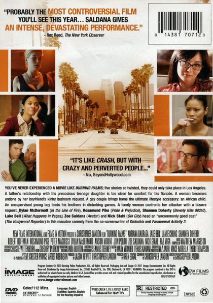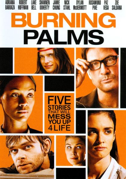 You've never experienced a movie like Burning Palms; five stories so twisted, they could only take place in Los Angeles. A father's relationship with his precocious teenage daughter is too close for comfort for his fiancée. A woman becomes undone by her boyfriend's kinky bedroom request. A gay couple brings home the ultimate lifestyle accessory: an African child. An unsupervised young boy leads his brothers in disturbing games. A lonely woman confronts her attacker with a bizarre request. Dylan McDermott (In The Line Of Fire), Rosamund Pike (Pride And Prejudice), Shannen Doherty (Beverly Hills 90210), Lake Bell (What Happens In Vegas), Zoe Saldana (Avatar), and Nick Stahl (Sin City) head an "uncommonly good cast" (Hollywood Reporter) in this macabre comedy from the co-screenwriter of Disturbia and Paranormal Activity 2.