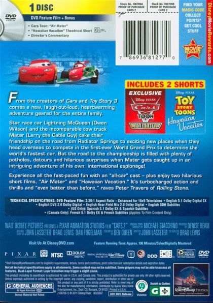 Star race car Lightning McQueen and his pal Mater head overseas to compete in the World Grand Prix race. But the road to the championship becomes rocky as Mater gets caught up in an intriguing adventure of his own: international espionage. |