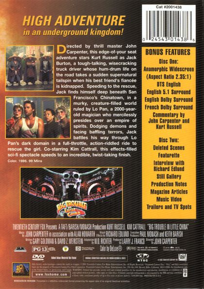 After a card game, Jack Burton takes his friend, Wang Chi (Dennis Dun), to the airport to pick up Wang’s fiancee, Miao Yin (Suzee Pai), but the Lords of Death snatch her and steal Jack’s eighteen wheeler, The Pork Chop Express. Evil 2000-year-old Chinese sorcerer, David Lo Pan (James Hong) plans to marry Miao Yin, a green eyed beauty, and then sacrifice her in order to overcome an ancient curse. To save the girl and his truck, Jack heads for Chinatown with Wang, and beautiful lawyer Gracie Law (Kim Cattrell). Unfortunately for Gracie, she also is beautiful and green-eyed, so Lo Pan decides to marry and kill her instead of Miao Yin. Also, unfortunately for Gracie, Jack is a fake John Wayne: he talks a good game and sounds like the Duke but literally knocks himself out. Rival Chinese gangs take sides, and three evil demi-gods show up as the fight goes underground, in a dark and dank supernatural world beneath Chinatown. Jack and Wang are helped by loopy magician Egg Shen (Victor Wong), Margo (Kate Burton), and Eddie Lee (Donald Li) as kung fu warriors, female ninjas, and unearthly creatures battle.