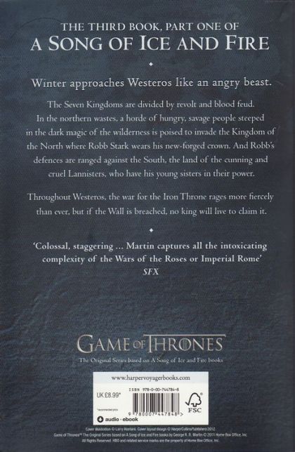 Of the five contenders for power, one is dead, another in disfavor, and still the wars rage as violently as ever, as alliances are made and broken. Joffrey, of House Lannister, sits on the Iron Throne, the uneasy ruler of the land of the Seven Kingdoms. His most bitter rival, Lord Stannis, stands defeated and disgraced, the victim of the jealous sorceress who holds him in her evil thrall. But young Robb, of House Stark, still rules the North from the fortress of Riverrun. Robb plots against his despised Lannister enemies, even as they hold his sister hostage at King's Landing, the seat of the Iron Throne. Meanwhile, making her way across a blood-drenched continent is the exiled queen, Daenerys, mistress of the only three dragons still left in the world. But as opposing forces maneuver for the final titanic showdown, an army of barbaric wildlings arrives from the outermost line of civilization. In their vanguard is a horde of mythical Others--a supernatural army of the living dead whose animated corpses are unstoppable. As the future of the land hangs in the balance, no one will rest until the Seven Kingdoms have exploded in a veritable storm of swords.