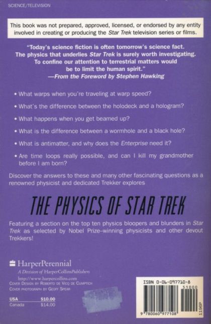 What warps when you're traveling at warp speed?What's the difference between a holodeck and a hologram?What happens when you get beamed up?What's the difference between a wormhole and a black hole?What is antimatter, and why does the Enterprise need it?Are time loops really possible, and can I kill my grandmother before I am born?Discover the answers to these and many other fascinating questions from a renowned physicist and dedicated Trekker.Featuring a section on the top ten physics bloopers and blunders in Star Trek as selected by Nobel-Prize winning physicists and other devout Trekkers!"Today's science fiction is often tomorrow's science fact. The physics that underlines Star Trek is surely worth investigating. To confine our attention to terrestrial matters would be to limit the human spirit."--From the foreword by Stephen HawkingNATIONAL BESTSELLER!This book was not prepared, approved, licensed, or endorsed by any entity involved in creating or producing the Star Trek television series or films.