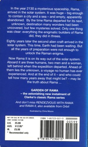 In the year 2130 a mysterious spaceship, Rama, arrived in the solar system. It was huge, but empty - apparently abandoned. By the time Rama departed for its next unknown destination many wonders had been uncovered, but few mysteries solved. Only one thing was clear: everything the enigmatic builders of Rama did, they did in threes. Eighty years later the second alien craft arrived in the solar system. This time, Earth had been waiting. Now Rama II is on its way out of the solar system. Aboard it are three humans, two men and a woman, left behind when the expedition departed. Ahead of them lies the unknown, a voyage no human has ever experienced. And at the end of it may lie the truth about Rama. Look out for more information on this book and others on the Orbit website at www.orbitbooks.co.uk