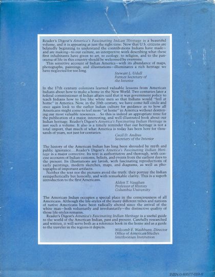 History of North American Indians and Eskimos from pre-historic times. Amply illustrated; 13 chapters: 1, The First Indians: Finding a New World; 2, Lost Indian Civilizations: Kingdoms of the Sun; 3, North America in 1500; 4, The Southeast: The Five Civilized Tribes; 5, The Northeast & Great Lakes: Woodland Warriors; 6, The Great Plains: Nomadic Horsemen; 7, The Southwest: Planters & Herdsmen; 8, Great Basin, California, Plateau: Foragers & Gatherers; 9, The Northwest Coast: Traders & Fishermen; 10, The Subarctic: People of the Caribou; 11, The Arctic: Dwellers in an Icy World; 12, Contemporary Indians: Renaissance of an Ancient People; and, 13, Seeing Indian History.
