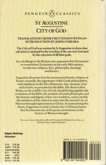 The City of God was written by St Augustine to show that salvation is attained by the worship of the one true God and by the rejection of all false gods.As a challenge to the Roman neo-paganism that threatened to overwhelm Christianity in the early fifth century, it embraces religious lore, philosophy, theology and history.Augustine discussed first the ancient polytheistic religion of Rome; secondly, the arguments of the Greek philosophers, with emphasis on the Neo-Platonists; last, creation, time and eternity as presented in the Bible. His thesis is that Rome, as the earthly City of God, should bring together the revelation of the Bible, the wisdom of Greek philosophy and the honour and dignity of her own tradition, and so enable the members of her church to enter into the eternal City of Heaven through regeneration in Christ. In representing this thesis, Augustine created a charter for a Christian future that has become one of the great cornerstones in the history of Western thought.