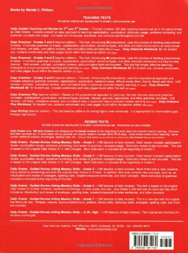 Based on the prepositional approach to grammar,Easy Grammar Plus includes extensive grammar concepts, capitalization, punctuation, sentence types, phrases, clauses, gerunds, appositives, and other grammar concepts. Unit reviews, unit texts, cumulative reviewes, and cumulative tests in grammar help to promote mastery learning. The book is for teachers, as a teaching text; for parents, for homeschooling or helping your child through school; and for individuals, for an easty do-it-yourself refresher course. Right-hand pages are for testing or review; left-hand pages contain answers. Pages are reproducible for multiple use (non-commerical).
