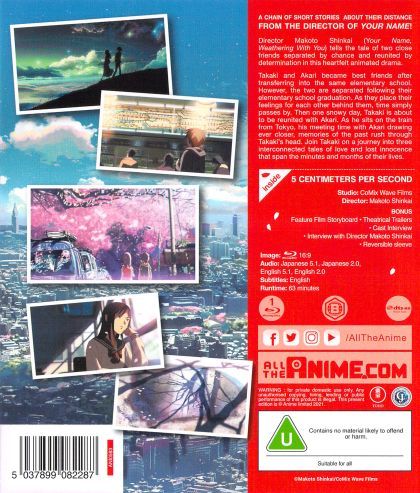 Three moments in Takaki's life: his relationship with Akari and their forced separation; his friendship with Kanae, who is secretly in love with him; the demands and disappointments of adulthood, an unhappy life in a cold city.