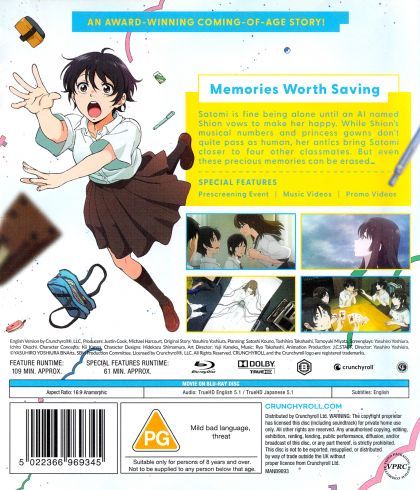 Satomi is fine being alone until an AI named Shion joins her class with a song and a promise to make her happy. While Shion’s musical numbers and princess gowns don’t quite pass as human, her antics bring Satomi closer to four other classmates. Together, they make memories worth saving, but even our most precious data can be erased.