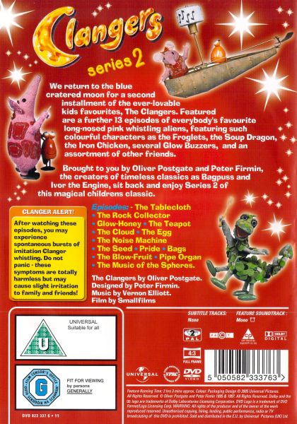 The Clangers are strange, long-nosed, pink, woolly creatures that live inside a small blue planet, which lies far, far away in space.Under the dustbin-lidded craters that cover the planet's surface is the cave system where the these strange yet cuddly extraterrestrials live. They share their world with the bizarre Soup Dragon, who lives in a soup well and provides them with their staple diet of green soup and blue string pudding; the Glow Buzzers, which supply light and tasty glow honey; and the tiny orange Froglets, magical creatures that live inside a travelling top-hat. Other beings encountered by the Clangers are the Iron Chicken, originally found in pieces and who, once reconstructed by the little planet's inhabitants, now lives in a nest in the sky; the large, odd, blue-skinned Skymoos; and the water-providing Cloud.