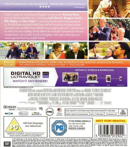 The Second Best Exotic Marigold Hotel is the expansionist dream of Sonny (Dev Patel), and it's making more claims on his time than he has available, considering his imminent marriage to the love of his life, Sunaina (Tina Desai). Sonny has his eye on a promising property now that his first venture, The Best Exotic Marigold Hotel for the Elderly and Beautiful, has only a single remaining vacancy - posing a rooming predicament for fresh arrivals Guy (Richard Gere) and Lavinia (Tamsin Greig). Evelyn and Douglas (Judi Dench and Bill Nighy) have now joined the Jaipur workforce, and are wondering where their regular dates for Chilla pancakes will lead, while Norman and Carol (Ronald Pickup and Diana Hardcastle) are negotiating the tricky waters of an exclusive relationship, as Madge (Celia Imrie) juggles two eligible and very wealthy suitors.