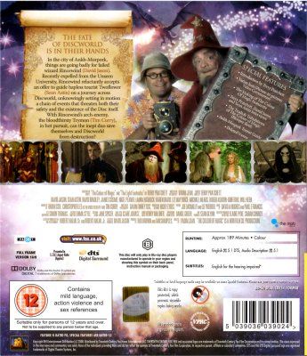 Based on Terry Pratchett's popular Discworld series of fantasy adventure novels. Naïve tourist Twoflower (Sean Astin, "Lord of the Rings") is on holiday in Ankh-Morpork. A fire breaks out, and he flees the city with an incompetent wizard named Rincewind (Sir David Jason, "Hogfather"). The pair sets out on a magical journey, unaware that the Archchancellor of the Unseen University is trying to track them down to recapture a powerful spell in Rincewind's head.