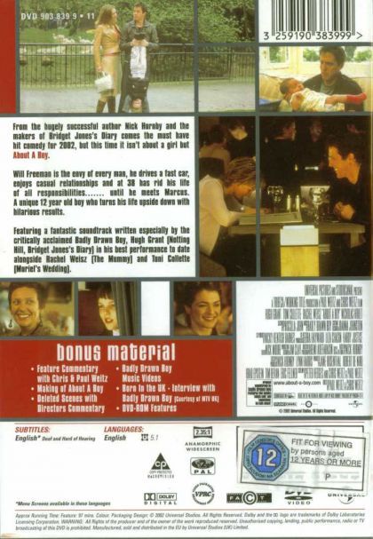 "About a Boy" features Hugh Grant as Will, a 40ish man who has no responsibility and does not want any. He lives off the royalties of a Christmas song his father wrote years ago. After dating a single mom, he decides that they are the future of dating. To meet single mothers, he joins S.P.A.T. (Single Parents Alone Together), a single parent support group, by pretending that he has a two year old son. Through the group, he meets Marcus Brewer, a dorky preteen who does not fit in at his new school and is struggling with his mother's battle with depression.