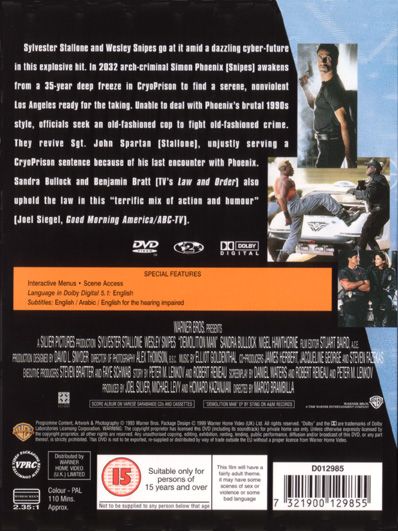 When cop John Spartan (Sylvester Stallone) crosses the line in the capture of crime lord Simon Phoenix (Wesley Snipes), both he and Phoenix end up on ice in the newest form of incarceration. Fast forward nearly forty years to the 2032, the once violent anarchic city of Los Angeles has now become a clean and saintly city and has been renamed San Angeles to boot. Unfortunately not everyone is clean and in fact the mayor, Raymond Cocteau (Nigel Hawthorne) orchestrates the escape of Phoenix. After his escape the sanitized and non-violent police force quickly realizes that they cannot stop him so they decide to bring back the only man that was ever able to stop him and that is John Spartan. Spartan is out of place in this sterile future, but Lenina Huxley (Sandra Bullock) is willing to partner up with him. Together the two of them must stop Phoenix from completing the purpose of his escape, which is to kill Edgar Friendly (Denis Leary) resistance leader and enemy of the mayor. Will they succeed or will it just be a demolition?