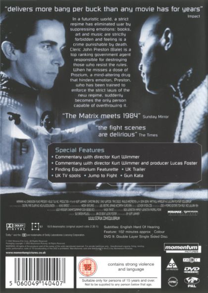 This film is set in the future where wars & violence has sent the world into chaos. The government has decided that any type of emotion is wrong. Greed, anger, love & happiness, as well as all other emotions are to be suppressed by taking a medication provided by the government. Failure to do so is punished by death. Books, music & art have been outlawed as they could trigger emotion & having possession of them is punishable by death. The law is enforced by the Grammaton Clerics who are headed by John Preston (Christian Bale). His wife has been executed for being a sense offender & he is left with two children. Now he has missed his medication & is starting to feel emotions for the first time. His young son & his partner are begining to suspect him.
