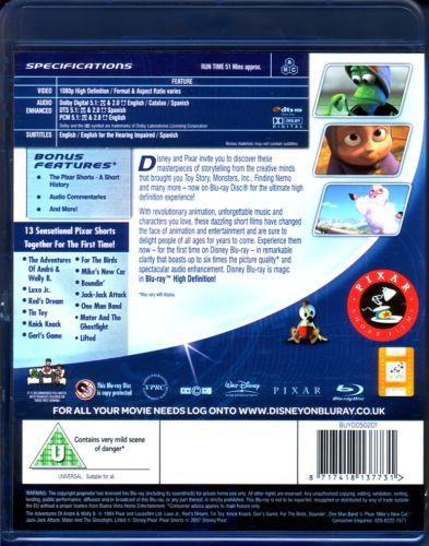 A collection of all Pixar short subjects released up until 2007, this compilation contains "The Adventures of Andre & Wally B," "Luxo Jr.," Red's Dream," "Tin Toy," "Knick Knack," "Geri's Game," "For The Birds," "Mike's New Car" (with John Goodman and Billy Crystal), Boundin', "Jack-Jack Attack," "One Man Band," "Mater and the Ghostlight" (with Owen Wilson and Larry the Cable Guy), and "Lifted." Also included is the documentary "Pixar Shorts: A Short History," starring the crew of Pixar Studios.