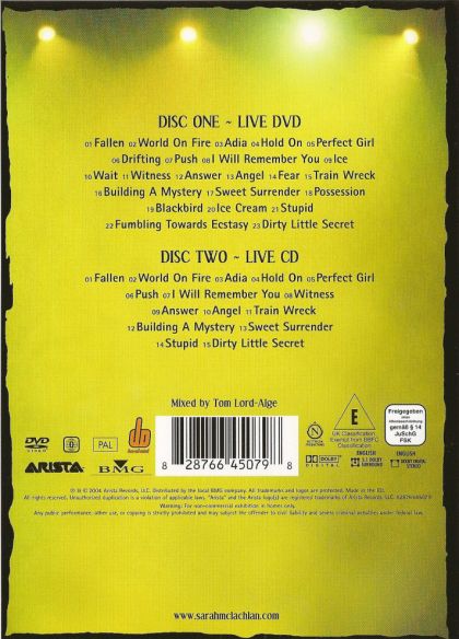 In her own words Sarah McLachlan 'for the first time has enough material that she can choose from' and in this live concert she gives us all of her and our favorite tracks. A sensational concert that brings that brilliant voice to share with the world and a very memorable concert experience.