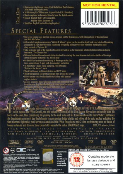 “Star Wars: Revenge of The Sith” tells of the last days of Anakin Skywalker, the man who would become Darth Vader. The Clone Wars have been going on for years, and the Jedi battle with the Separatists, lead by the mysterious Darth Sidious and his second-in-command, General Grievous. Chancellor Palpatine, leader of the Intergalactic Senate, has been kidnapped, and it is up to the Jedi to rescue him and restore peace to the universe. Anakin has become friendly with the Chancellor, who many believe to be corrupt, much to the dismay of the Jedi Council. Later, they decide to use this friendship to their advantage, asking the young Knight to spy on Palpatine. In the meantime, Anakin's wife, Padme (the former Queen Amidala) has found out that she is pregnant. While this should be great news, there are problems, as Anakin is plagued by visions of her dying during childbirth. The chancellor informs him, during one of their talks, that he has incredible powers, even hinting that he can prevent death. As the battle rages on, Anakin must decide where his loyalties lie and how far he will go to save the woman he loves.