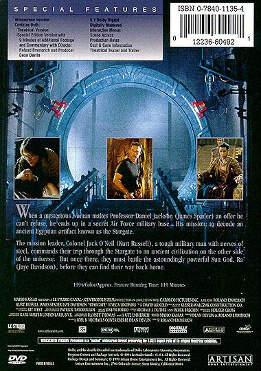 Recruited by the Air Force to translate hieroglyphs on a mysterious artifact, Egyptologist Dr. Daniel Jackson discovers the instructions to an alien Stargate, a portal to another planet. He joins a military team led by Colonel Jack O’Neil, and together they travel to a world populated by misplaced humans, the descendents of Earth’s own ancient Egyptians. The team manages to befriend the inhabitants with chocolate and good will, and Daniel even manages to become inadvertently betrothed to the young daughter of their leader. But they are still struggling to learn the language when confronted by a formidable enemy. The alien who enslaves the new world, encased inside a human host and surrounded by an entourage of powerful soldiers armed with energy weapons, arrives with show of force. He takes hostages, among them Daniel’s new wife, and blocks the newcomers from returning home through the Stargate. The ensuing battle quickly becomes a struggle to rescue both the new world and Earth.