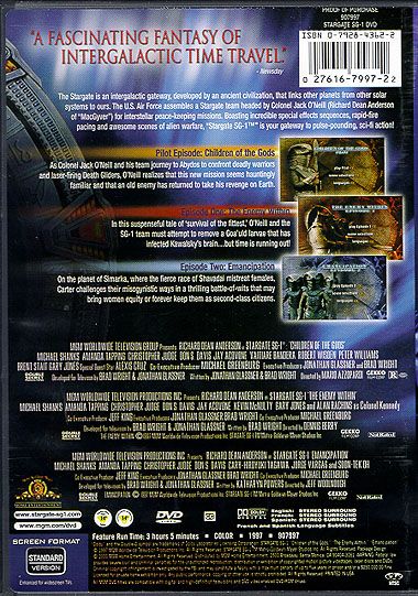 Air Force Cornel Jack O’Neill (Richard Dean Anderson) is the leader of SG-1. He leads his team, Dr Samantha Carter (Amanda Tapping), Daniel Jackson (Michael Shanks) and Teal’c (Christopher Judge), on missions through the Stargate to other planets. Some of the planets that they visit are friendly; other planets do not trust anybody that comes through the Stargate and they try to kill them. Samantha Carter is a major with the Air Force and a brilliant astrophysics. Daniel Jackson is an archaeologist and linguist; he is mostly there to learn about other cultures. Teal’c is a Goa’uld that helped the SG team escape when his master was planning to kill them; he escaped with them and joined the SG team.