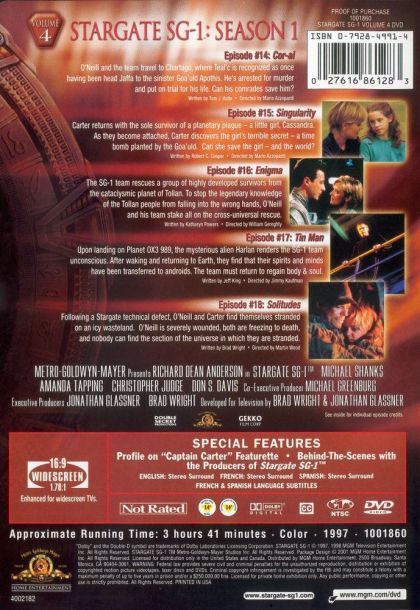 Air Force Cornel Jack O’Neill (Richard Dean Anderson) is the leader of SG-1. He leads his team, Dr Samantha Carter (Amanda Tapping), Daniel Jackson (Michael Shanks) and Teal’c (Christopher Judge), on missions through the Stargate to other planets. Some of the planets that they visit are friendly; other planets do not trust anybody that comes through the Stargate and they try to kill them. Samantha Carter is a major with the Air Force and a brilliant astrophysics. Daniel Jackson is an archaeologist and linguist; he is mostly there to learn about other cultures. Teal’c is a Goa’uld that helped the SG team escape when his master was planning to kill them; he escaped with them and joined the SG team.