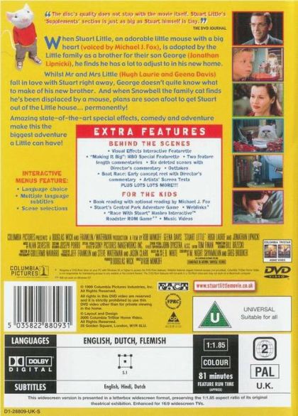 Manhattanites Eleanor (Geena Davis) and Fredrick Little (Hugh Laurie) go to an orphanage to adopt a little brother for their son George (Jonathan Lipnicki). Despite warnings not to adopt across species lines, they end up taking home Stuart (Michael J, Fox), a cute and talkative white mouse with a terrific wardrobe and a case of incurable optimism. George is understandably not too thrilled that his new little brother is actually little, but warms to him after Stuart helps him win a model boat race in Central Park. The family cat, Snowbell (Nathan Lane), is not so easily swayed and decides to rid the family and the world of Stuart for good. With the aid of his friend Monty (Steve Zahn) and various catnip-addicted alley cats, Snowbell hires two mice, Mr. Reginald 'Reggie' (Bruno Kirby) and Mrs. Camille Stout (Jennifer Tilly) to impersonate Stuart’s long lost parents. They come and take him away from the loving arms of his new family and then abandon him to the cold world of Central Park after dark. Stuart faces trials and tribulations aplenty before finally making his way back home.