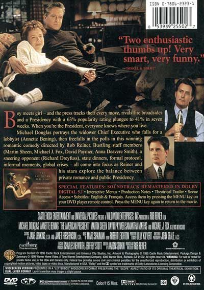What sounds like a high-concept romantic comedy pitch from hell--widower president falls for smart lobbyist while the world watches--is actually intelligent, charming, touching and quite funny. Granted, it's wish fulfilment all the way (when was the last time you saw a president who was truly presidential?) but in the capable hands of writer Aaron Sorkin (TV's Sports Night) and director Rob Reiner, TheAmerican President is incredibly enjoyable entertainment with quite a few ideas about both romance and the government. Michael Douglas stars as the president, who after three years in office starts thinking about the possibility of dating. When he auspiciously encounters cutthroat environmental lobbyist Sydney Ellen Wade (Annette Bening), sparks begin to crackle and the two begin a tentative but heartfelt romance. Of course, his job gets in the way--their first kiss is interrupted by a Libyan bombing--but darn it if these two kids aren't going to try and make it work! However, they hadn't counted on the president's Republican antagonist (Richard Dreyfuss), who starts carping about family values. The predictable plot--Douglas finally goes to bat for his lady and his country--is leavened by Sorkin's wonderful, snappy dialogue and a light touch from the usually subtle-as-a-sledgehammer Reiner. Both manage to create a believable White House-office atmosphere (with a crack staff including Martin Sheen, Michael J. Fox, Anna Deavere Smith and Samantha Mathis) as well as a plausible and funny dating scenario. The true success of the movie, though, rides squarely on Douglas and Bening; this is unequivocally Douglas's best comedic performance (ergo his best performance, period) and Bening, usually such a good bad girl, takes a standard career-woman role and fleshes it out magnificently. You can see in an instant why Douglas would fall for her. One of the best unsung romantic comedies of the 90s. --Mark Englehart