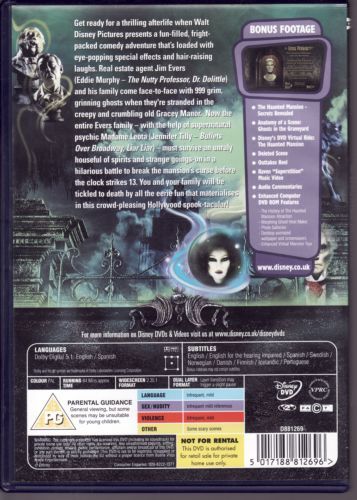 Jim (Eddie Murphy) and Sara Evers (Marsha Thomason), are realtors that go on a working vacation to the swamps near New Orleans. Along with them are their two children, 10 year old Michael (Marc John Jefferies) and 13 year old Megan (Aree Davis). They stop to examine Garcey Manor, a property they have been asked to sell. A terrible rainstorm forces them to stay the night with butler Ramsley (Terence Stamp) and Master Edward Gracey (Nathaniel Parker), who eye Sara strangely. Separated and forced to undergo various ghostly adventures, Jim and the kids eventually find each other again. They then work to defeat the mansion’s curse and save Sara, with the help of footman Ezra (Wallace Shawn), maid Emma (Dina Waters), and the exceedingly talkative head of gypsy Madame Leota (Jennifer Tilly). The movie is very loosely based on the Disney “Haunted Mansion” ride and also refers to the European version, “Phantom Mansion.”