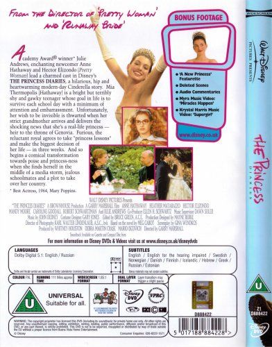 Mia Thermopolis (Anne Hathaway) is a high-school girl who lives with her artist mom in a renovated fire station. Though she isn't the most popular girl at school, she has a good time with her best friend Lily. Lily's brother Michael is also a good friend, but little does Mia know that he has a big crush on her. Mia comes home from school one day and learns that the father she never met is the king of a tiny European country called Genovia, and she is the heir to the throne. Her grandmother the queen (Julie Andrews) comes to visit her, and proceeds to give her lessons in etiquette and royal charm. With the help of the royal stylist and her prim and proper grandmother, Mia is transformed from awkward teenager into gorgeous princess. The popular crowd at school starts to take notice of Mia, and her newfound fame starts to change her. She starts neglecting her old friends and starts to date the most popular boy in school. However, as Mia becomes closer to the crown she realizes that this behavior is anything but princess-like, and she tries to fix all her mistakes.