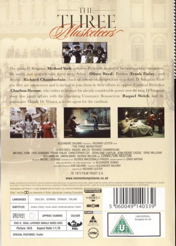 In Renaissance Paris, D'Artagnan (Michael York) is a young swordsman sent by his father to seek a commission in the King's Musketeers. After making the acquaintance of Musketeers Athos (Oliver Reed), Porthos (Frank Finlay), and Aramis (Richard Chamberlain), he soon finds himself enmeshed in a web of intrigue as Cardinal Richeleu (Charlton Heston) has his subordinates Rochefort (Christopher Lee) and Lady de Winter (Faye Dunaway) kidnap seamstress Constance de Bonacieux (Racquel Welch) to get proof that the Queen has secretly been having an affair with England's Duke of Buckingham (Simon Ward).