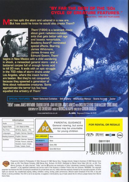 A dazed and traumatized young girl is found wandering the desert near White Sands, New Mexico. The only thing she can say is "Them!" An investigation reveals that her family was killed by giant ants. Dr. Medford (Edmund Gwen) and his daughter, Dr. Pat Medford (Joan Weldon) figure it out and aid the police in dealing with the ants. The ants mutated into giants because they were exposed to atomic radiation during test of the atom bomb in that area. The Medfords help policeman Ben Peterson (James Whitmore) fight the ants, including a dramatic battle in the Los Angeles sewer system.