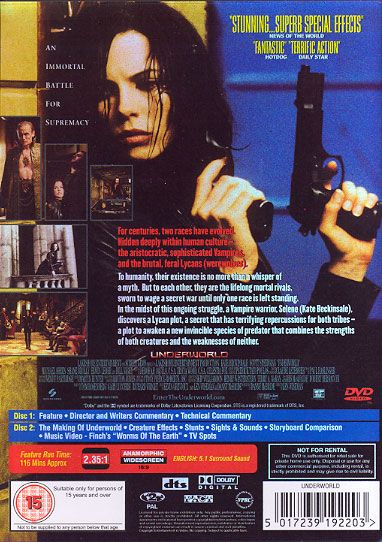 Vampires and werewolves are at war in a postmodern-looking world. Kate Beckinsale plays the part of one of the undead, killing werewolves as her duty to the race of vampires. When a hunt goes bad, she goes into hiding, and discovers that the long-thought-dead leader of the werewolves is in fact alive, and manages to fall in love with one of the enemy. It turns out that there's a conspiracy that ranges to the highest levels of the vampire world, and she's caught in the middle.
