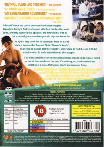 Julio Zapata (Gael Garcia Bernal) and Tenoch Iturbide (Diego Luna) are typical Mexican teenage boys looking to fill their summer after their girlfriends leave them for a trip to Europe. At a wedding party, they encounter Luisa (Maribel Verdu), the wife of Tenoch’s cousin, Alejandro (Juan Carlos Remolina) and, looking to impress the Spanish beauty, spin a tale about a beautiful beach on the coast of Oaxaca which they plan to visit. They invite her to come along, but she declines. However, after a troubling talk with her doctor, and a devastating confession from a drunken Alejandro that he has slept with another woman, she telephones Tenoch and says that she has changed her mind and that, yes, she would like to accompany he and Julio on their journey. Panicked, as they made up the entire story, Tenoch and Julio seek the advice of their drug-dealer friend Saba (Andres Almeida) about how they might find a place that would resemble their mythical Heaven’s Mouth. After receiving their instructions, the boys collect Luisa and the three of them set out on a journey across Mexico which provides them all with the opportunity for discovery of self, of each other, and of the day-to-day life of the people of their country.