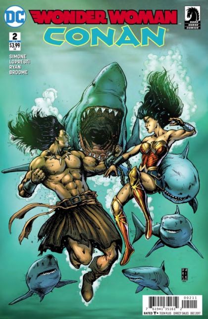 Diana has escaped the Cimmerian gladiator's arena, but she's exchanged that battleground for an equally dire fate. Now she's chained to Conan-the warrior who refused to fight-and they've been sold to a pirate's crew! When their ship founders in a storm, a leap into shark-infested waters seems like the safest course... Co-Published with Dark Horse Comics. RATED T+