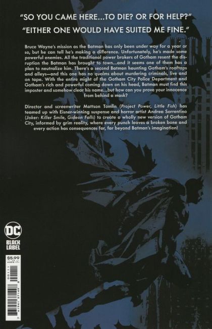 Bruce Wayne's mission as the Batman has only been underway for a year or so, but he can tell he's making a difference. Unfortunately, he's made some powerful enemies. All the traditional power brokers of Gotham resent the disruption the Batman has brought to town...and it seems one of them has a plan to neutralize him. There's a second Batman haunting Gotham's rooftops and alleys-and this one has no qualms about murdering criminals, live and on tape. With the entire might of the Gotham City Police Department and Gotham's rich and powerful coming down on his head, Batman must find this imposter and somehow clear his name...but how can you prove your innocence from behind a mask? Director and screenwriter Mattson Tomlin (Project Power, Little Fish) has teamed up with Eisner-winning suspense and horror artist Andrea Sorrentino (Joker: Killer Smile, Gideon Falls) to create a wholly new version of Gotham City, informed by grim reality, where every punch leaves a broken bone and every action has consequences far, far beyond Batman's imagination!