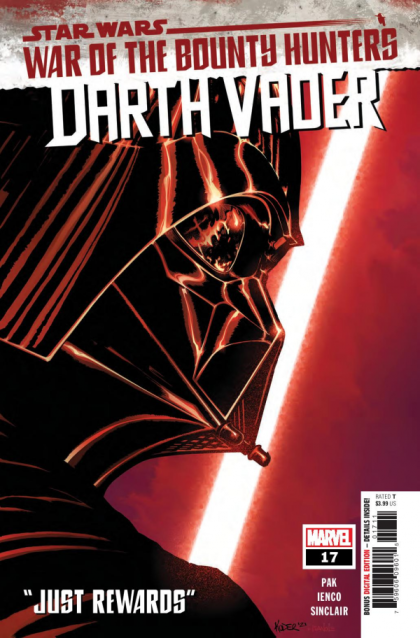 "JUST REWARDS" • Throughout the search for HAN SOLO, DARTH VADER has carved his way through shadows, unraveling mysteries cloaked in deceptions and betrayal. • Now Vader finally takes care of all his business in this blockbuster conclusion to the WAR OF THE BOUNTY HUNTERS story arc. • But is he the true master of betrayal in this tale? Or is there another? RATED T