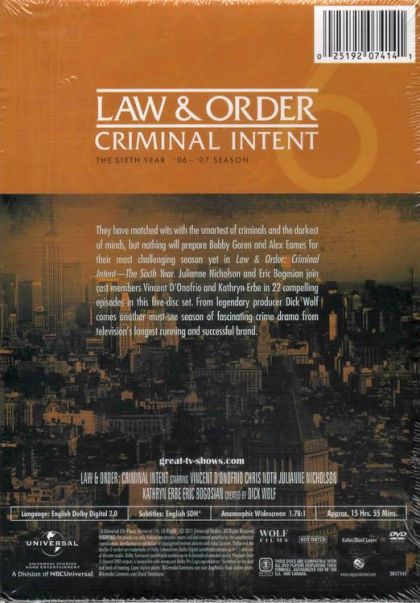 Groundbreaking producer Dick Wolf presides over his popular, Emmy Award-winning Law & Order franchise with Law & Order: Criminal Intent, broadcast on NBC during its first six seasons and then moved to NBC Universal sibling USA Network beginning with season seven. This legal crime drama is unique among the other franchise programs in that it offers an additional dimension by exposing major crimes from the criminal's perspective. Vincent D'Onofrio stars as Det. Robert Goren, an exceptionally bright homicide investigator with well-honed instincts that match up favorably with his criminal quarry. Likewise, his partner, Det. Alexandra Eames (Kathryn Erbe), brings an independence and stylish edge to her work that meshes well in tandem with Goren.