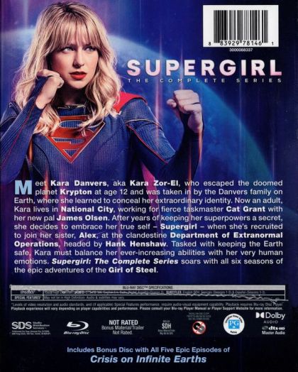 Meet Kara Danvers, aka Kara for-El, who escaped the doomed planet Krypton at age 12 and was taken in by the Danvers family on Earth, where she learned to conceal her extraordinary identity. Now an adult, Kara lives in National City, working for' fierce taskmaster Cat Grant with her new pal James Olsen. After years of keeping her superpowers a secret, she decides to embrace her true self - Supergirl - when she's recruited to join her sister, Alex, at the clandestine Department of Extranormal Operations, headed by Hank Henshaw. Tasked with keeping the Earth safe, Kara must balance her ever-increasing abilities with her very human emotions. Supergirl: The Complete Series soars with all six seasons of the epic adventures of the Girl of Steel.