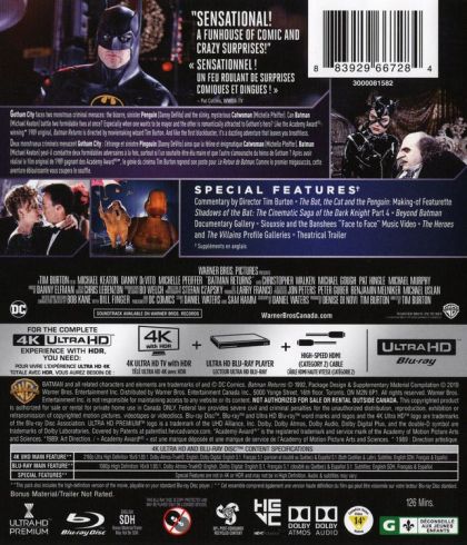 Gotham City faces two monstrous criminal menaces: the bizarre, sinister Penguin (Danny DeVito) and the slinky, mysterious Catwoman (Michelle Pfeiffer). Can Batman (Michael Keaton) battle two formidable foes at once? Especially when one wants to be mayor and the other is romantically attracted to Gotham's hero? Like the Academy Award°-winning• 1989 original, Batman Returns is directed by moviemaking wizard Tim Button. And like the first blockbuster, it's a dazzling adventure that leaves you breathless.
