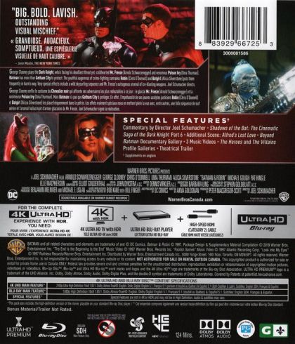 George Clooney plays the Dark knight, who's facing his deadliest threat yet: coldhearted Mr. Freeze (Arnold Schwarzenegger) and venomous Poison Ivy (Uma Thurman). Batman has more than Gotham City to protect: The youthful eagerness of crime-fighting comrades Robin (Chris O'Donnell) and Balgirl (Alicia Silverstone) puts them frequently in harm's way. Very special effects include a wild skysurfing sequence and Mr. Freeze's outrageous arsenal of ice-blasting weapons. Joel Schumacher directs.