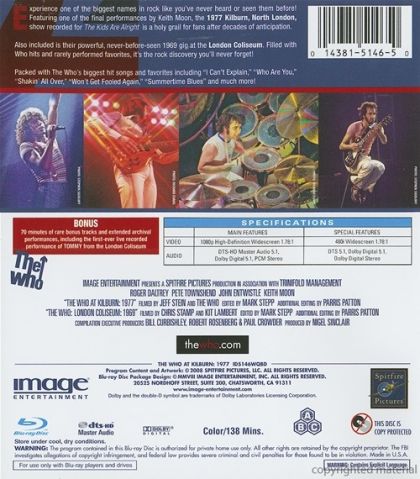 Featuring one of the last public appearances by Keith Moon, the 1977 Kilburn show is a long-sought holy grail for fans of The Who, performing before a select audience on December 15, 1977 at Kilburn. Also included is a much earlier never-before-seen rarity and one of the band's personal favorites, The Who's powerhouse London Coliseum gig from 1969.