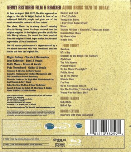 Mod rockers the Who are captured live by director Murray Lerner at the legendary Isle of Wight festival in 1970, attended by 600,000 people. All the old classics are included in a typically energetic set; Moon the Loon, Roger the Dodger and Pete... the guitarist. And John Entwistle on bass. This is the first DVD release, without the extra material found on the DVD/Blu-ray re-release of 2006.
