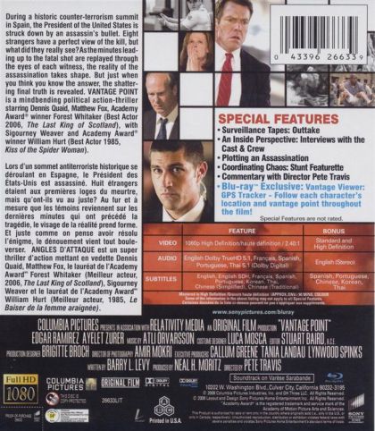 During the historic counter-terrorism summit in Spain, The President of the United States is struck down by an assassin's bullet. Eight strangers have a perfect view of the kill, but what did they really see? As the minutes leading up to the fatal shot are replayed through the eyes of each witness, the reality of the assassination takes shape. But just when you think you know the answer, the shattering final truth is revealed. VANTAGE POINT is a mind bending political action-thriller starring Dennis Quaid, Matthew Fox, Academy Award winner Forest Whitaker (Best Actor 2006), The Last King of Scotland), with Sigourney Weaver and Academy Award winner William Hurt (Best Actor 1985, Kiss of the Spider Woman).