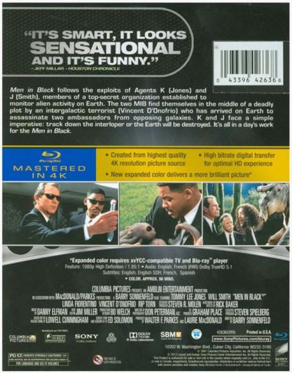Men In Black follows the exploits of agents Kay (Jones) and Jay (Smith), members of a top-secret organization established to monitor alien activity on Earth. The two MIB find themselves in the middle of a deadly plot by an intergalactic terrorist (Vincent D'Onofrio) who has arrived on Earth to assassinate two ambassadors from opposing galaxies. K and J face a simple imperative: track down the interloper or the Earth will be destroyed. It's all in a day's work for the Men In Black.