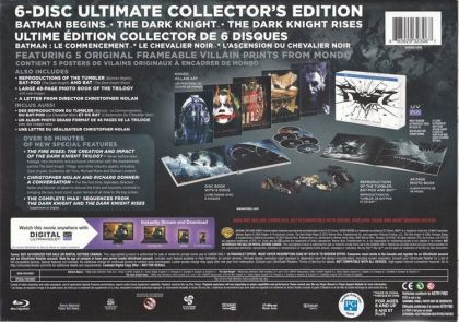 Three vehicles: Tumbler, Bat Pod, and Bat Mobile Five collectible artcards of Scarecrow, Joker, Bane, Harvey Dent, and Ra's al Ghul.