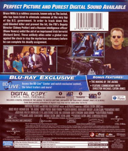 Bruce Willis is a ruthless assassin, known only as the Jackal, who has been hired to eliminate someone at the very top of the U. S. government. In order to track down this cold-blooded killer and prevent the hit, the FBI’s Deputy Director (Sidney Poitier) and a Russian intelligence officer (Diane Venora) enlist the aid of an imprisoned Irish terrorist (Richard Gere). These unlikely allies enter a global race against the clock to stop the mysterious mercenary before he can complete his deadly assignment.