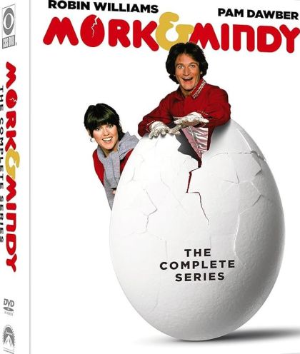 Mork & Mindy was a spin-off from an episode of Happy Days seen in February 1978, in which an alien from the planet Ork landed on Earth and attempted to kidnap Richie. So popular was the nutty character that Robin Williams was given his own series the following fall. Mork was a misfit on his own planet because of his sense of humor. So the humorless Orkans sent him off to study Earthlings, whose "crazy" customs they had never been able to understand. Mork landed, in a giant eggshell, near Boulder, Colorado. There he was befriended by pretty Mindy McConnell, a clerk at a music store run by her father, Frederick. Mork looked human, but his strange mixture of Orkan and Earthling customs such as wearing a suit, but putting it on backwards, or sitting in a chair, but upside down, led most people to think of him as just some kind of a nut. Mindy knew where he came from, and helped him adjust to Earth's strange ways. She also let him stay in the attic of her apartment house, which scandalized her conservative father, but not her swinging grandmother, Cora.