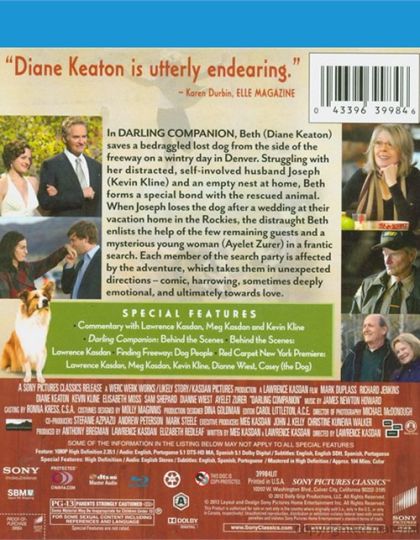 In Darling Companion, Beth (Diane Keaton) saves a bedraggled lost dog from the side of the freeway on a wintry day in Denver. Struggling with her distracted, self-involved husband Joseph (Kevin Kline) and an empty nest at home, Beth forms a special bond with the rescued animal. When Joseph loses the dog after a wedding at their vacation home in the Rockies, the distraught Beth enlists the help of the few remaining guests and a mysterious young woman (Ayelet Zurer) in a frantic search. Each member of the search party is affected by the adventure, which takes them in unexpected directions - comic, harrowing, sometimes deeply emotional and ultimately towards love.