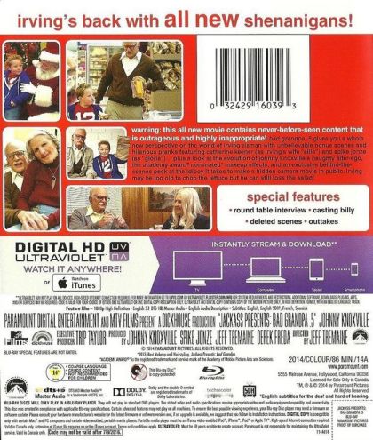 warning: this all new movie contains never-before-seen content that is outrageous and highly inappropriate! BAD GRANDPA .5 gives you a whole new perspective on the world of irving zisman with unbelievable bonus scenes and hilarious pranks featuring catherine keener (as irving's wife "ellie") and spike jonze (as "gloria")... plus a look at the evolution of johnny knoxville's naughty alter-ego, the academy award nominated makeup effects, and an exclusive behind-the-scenes peek at the idiocy it takes to make a hidden camera movie in public. irving may be too old to chop the lettuce but he can still toss the salad!